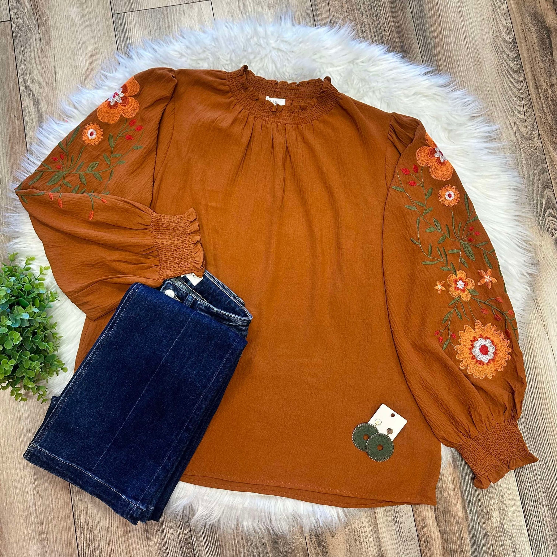 This women's top is designed with a curvy fit, providing a flattering silhouette for a variety of body types. The rust color and intricate embroidery on the sleeves add a touch of elegance to any outfit. Made for comfort and style, this top is perfect for any occasion.