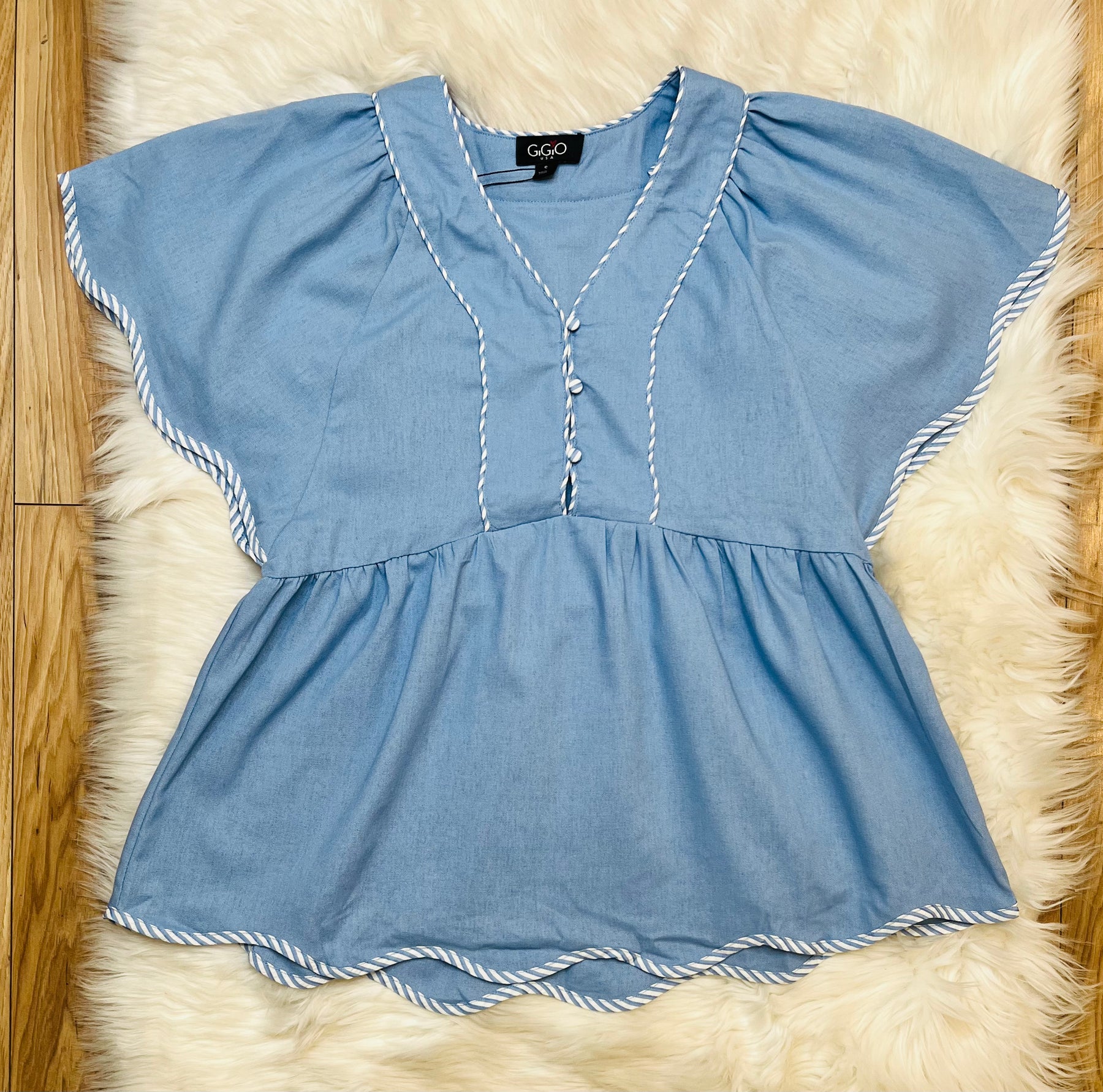 The Women’s GiGiO Light Blue Scalloped Top offers a refined silhouette complemented by scalloped edges, enhancing both style and comfort. Its fabric composition ensures breathability, making it suitable for various occasions. This top seamlessly combines elegance with practicality, appealing to those seeking versatile wardrobe options.