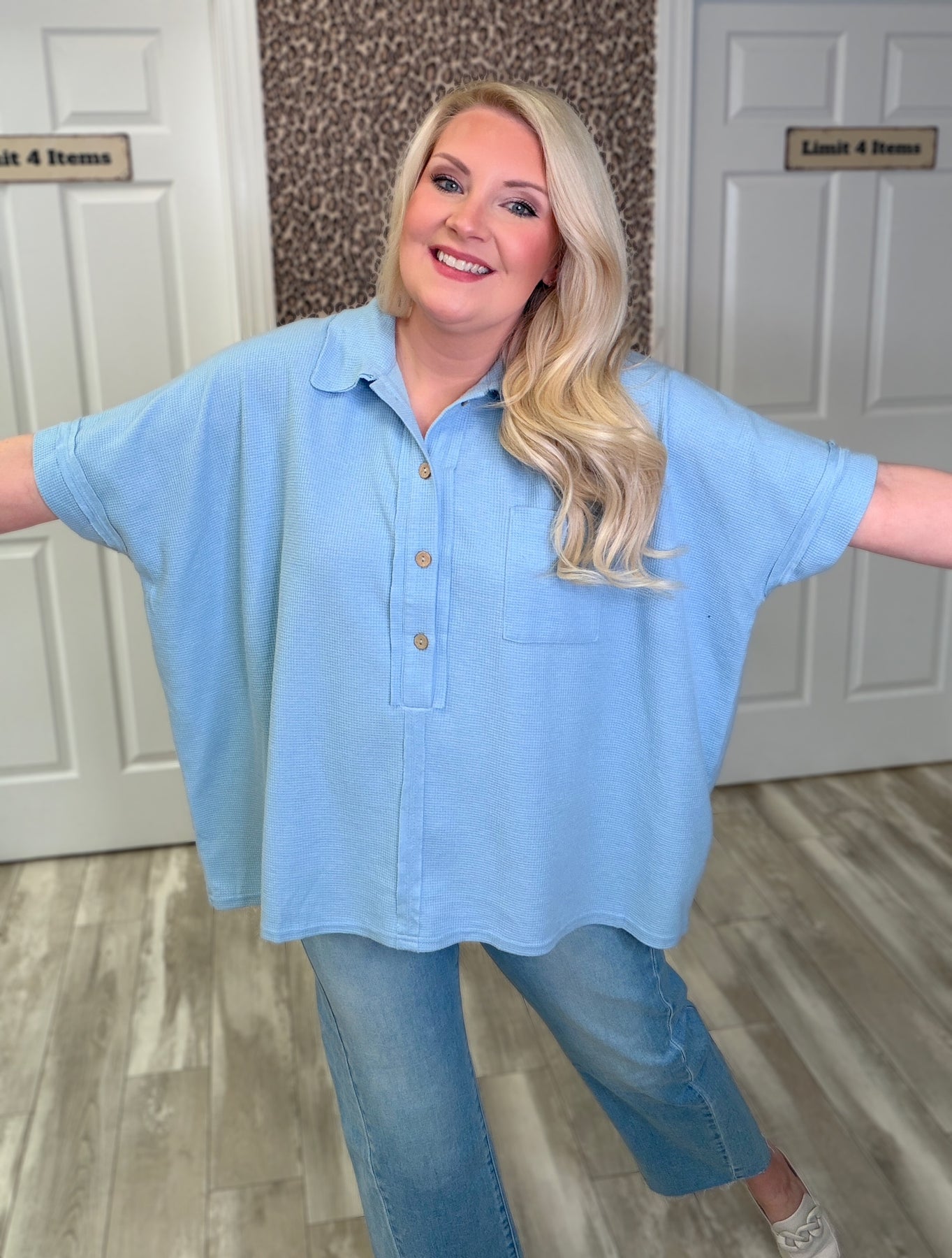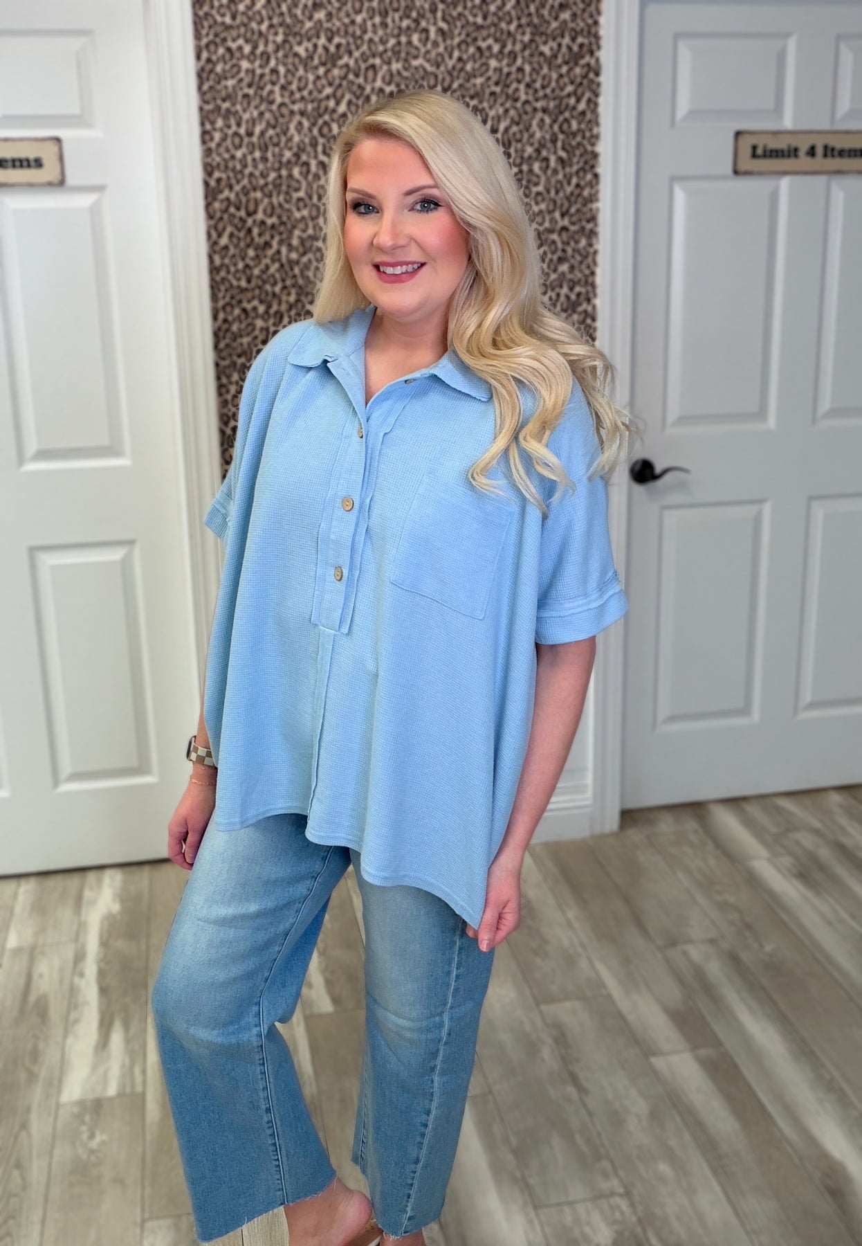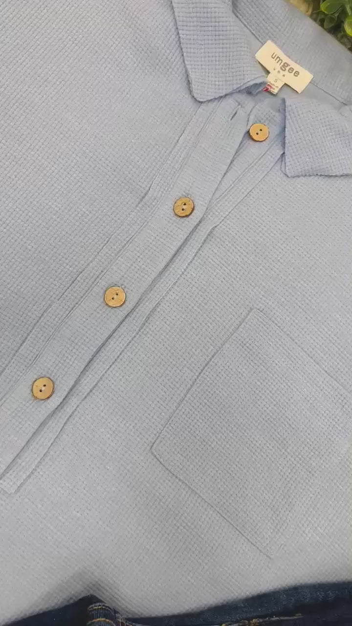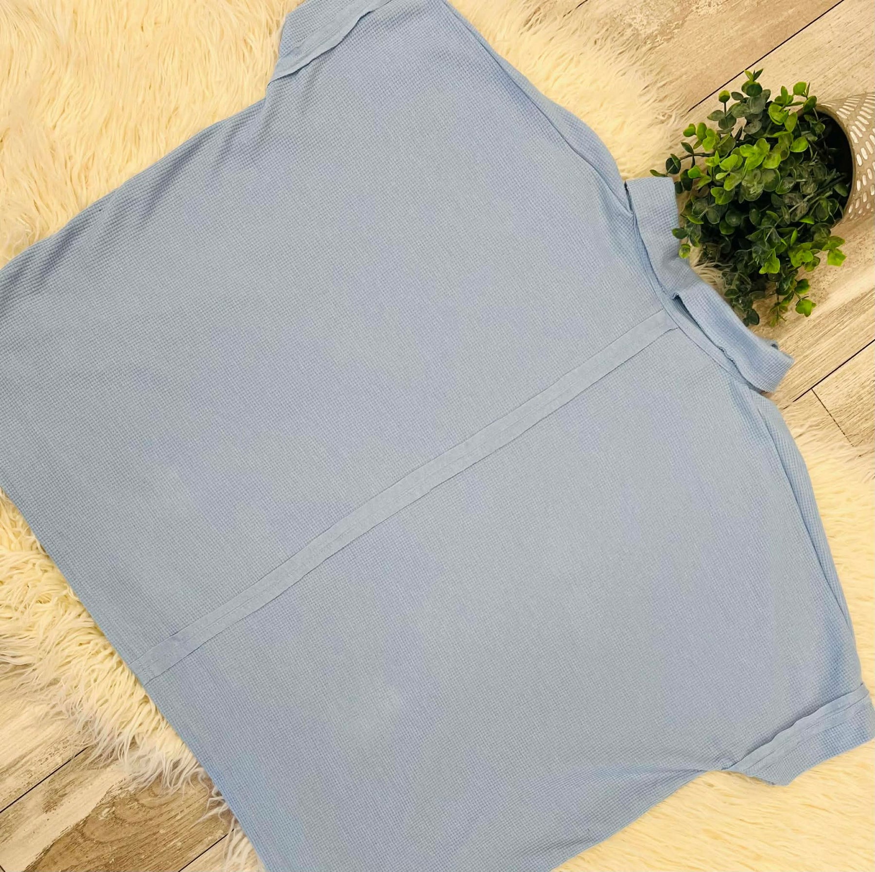 The Women’s Oversized Boxy Waffle Knit Button Down Top is designed for comfort and breathability, featuring a waffle knit texture that enhances airflow. Its loose fit allows for ease of movement, making it suitable for both casual and relaxed settings. Ideal for layering, this top offers versatility without compromising style. Runs very oversized. Model is wearing a small