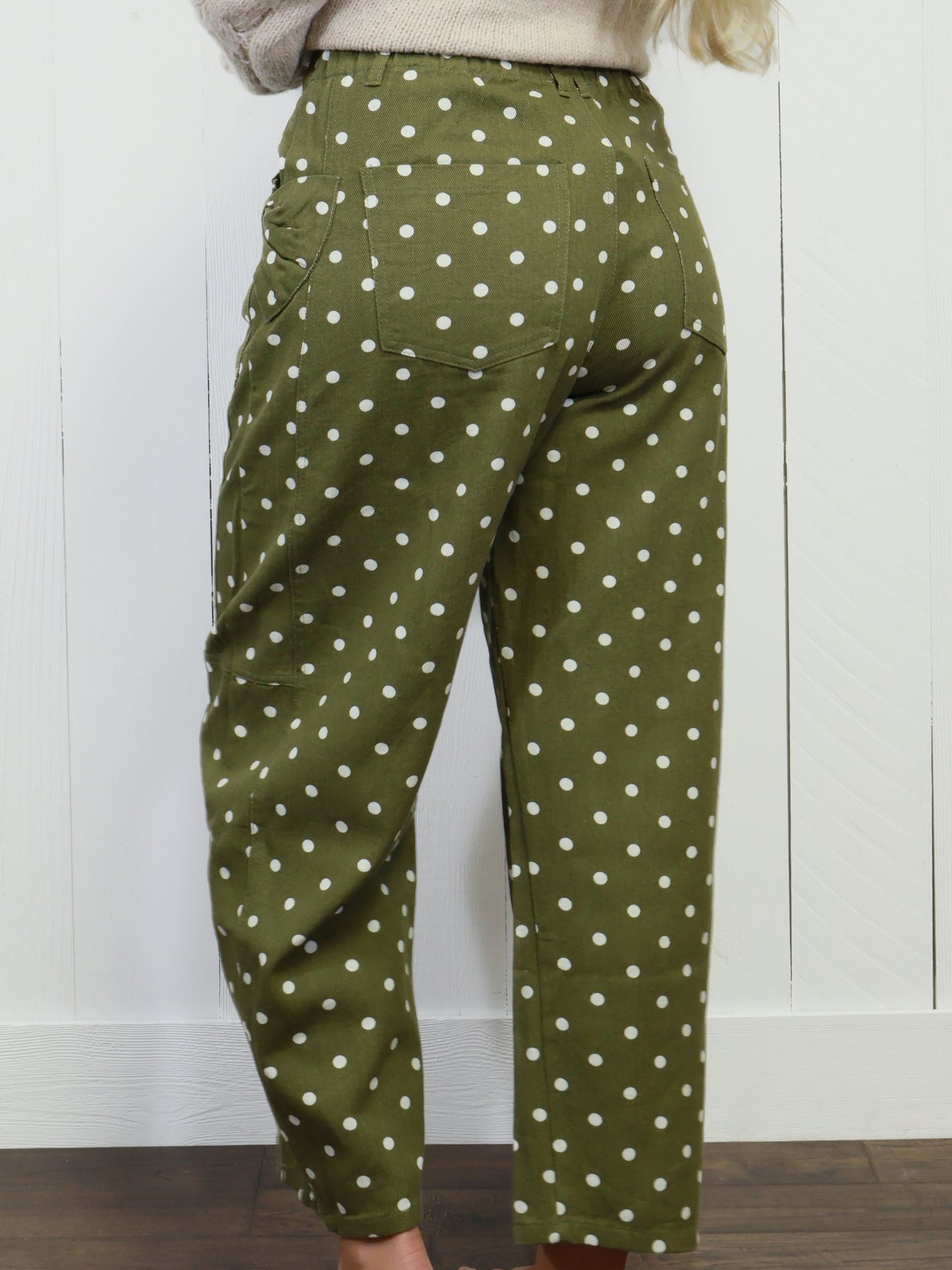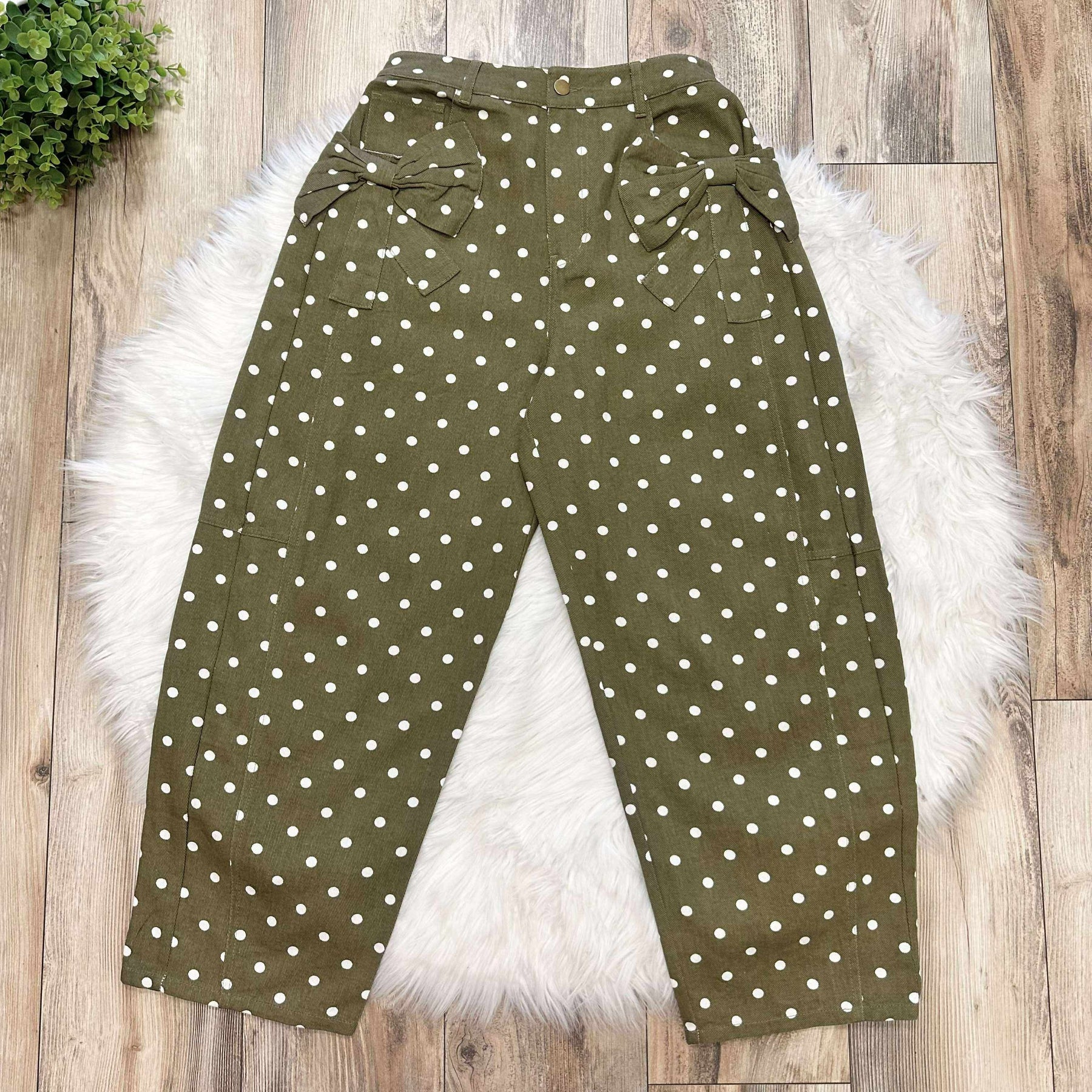 These Women's Olive Polka Dot Barrel Pants come equipped with bow pockets that add a touch of functionality and style. Perfect for any outfit, these pants are versatile and convenient, making them a must-have addition to any wardrobe. Stay fashionable and organized with these sleek and trendy pants.