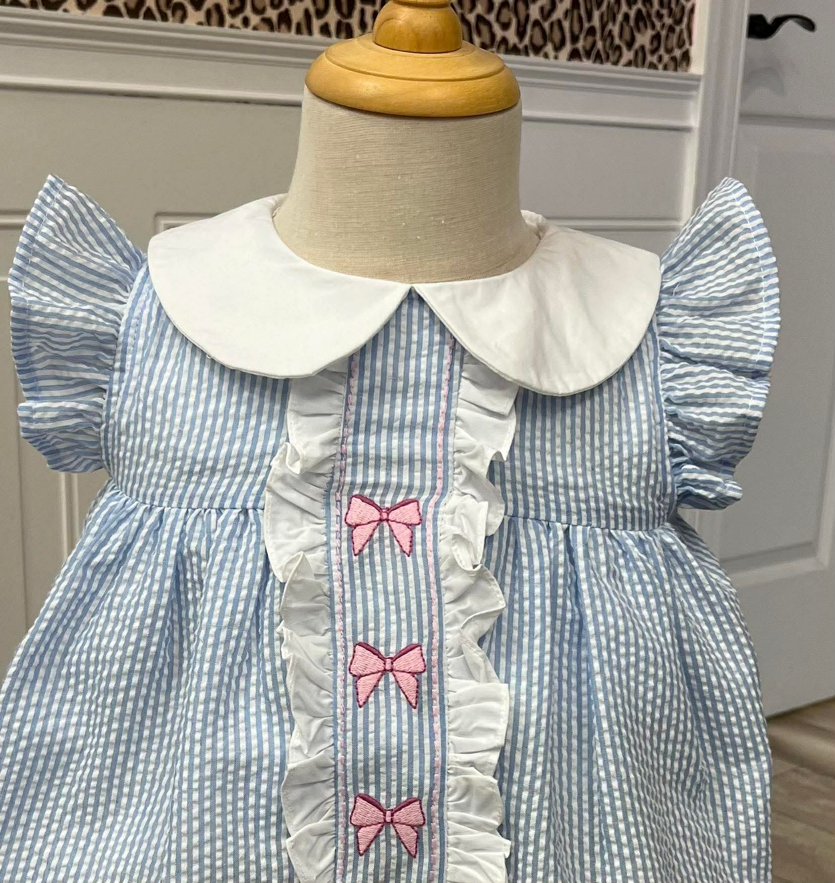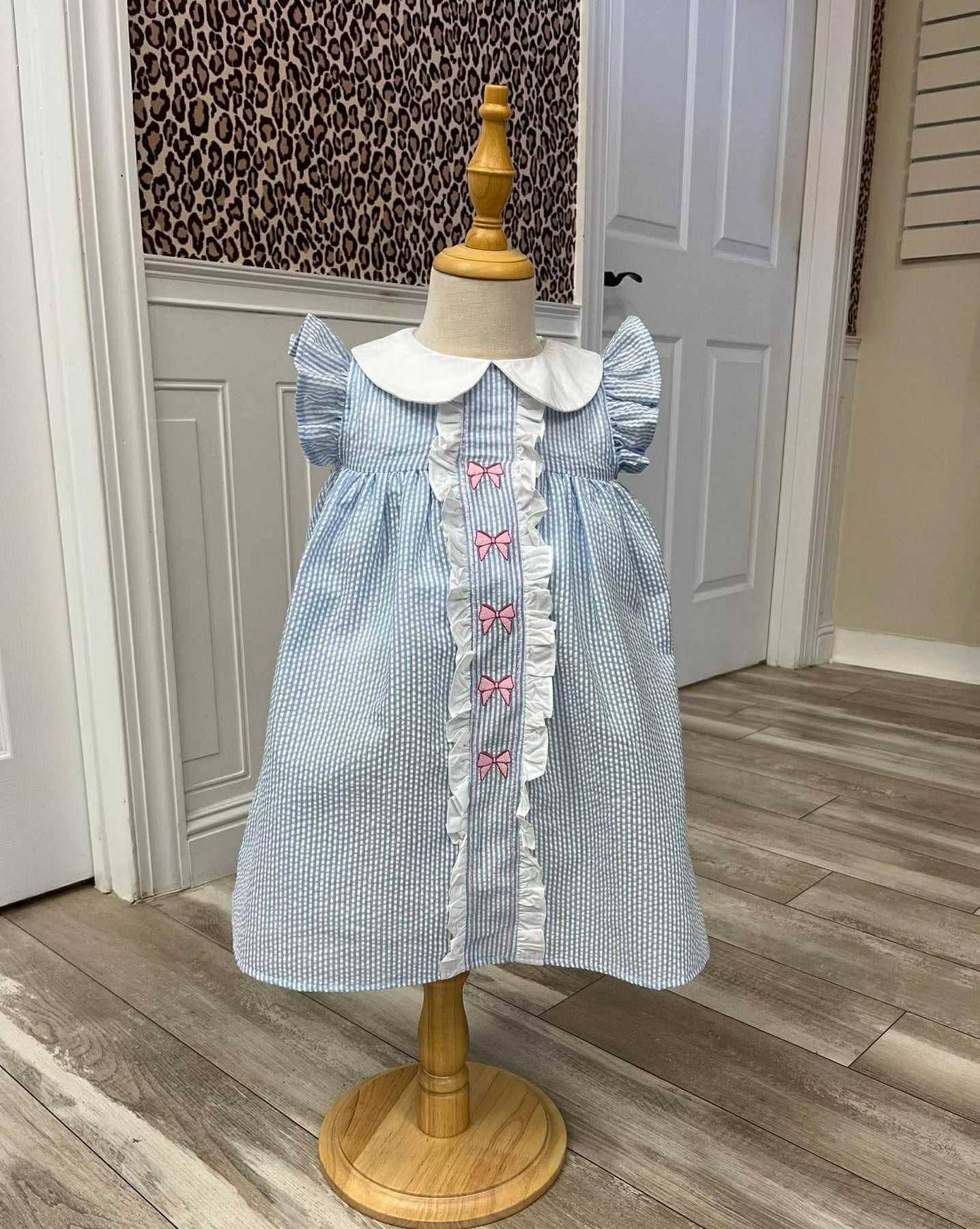 The Girls Seersucker Bow Embroidered Ruffle Trim Dress features a lightweight seersucker fabric, which provides breathability and comfort. The intricate bow embroidery and ruffle trims enhance its aesthetic appeal, making it suitable for both casual and semi-formal occasions. Its design is ideal for warm weather wear, promoting ease of movement.