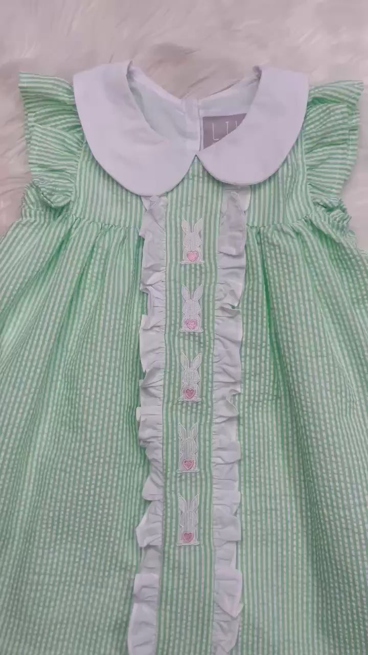 The Girls Seersucker Bunny Ruffle Sleeve Dress features a classic seersucker fabric, known for its lightweight and breathable qualities. The ruffle sleeves add a touch of elegance while ensuring freedom of movement. This dress is ideal for warmer weather, providing comfort and style for everyday wear.