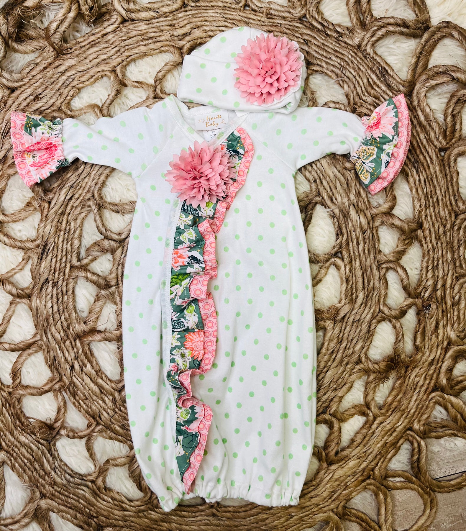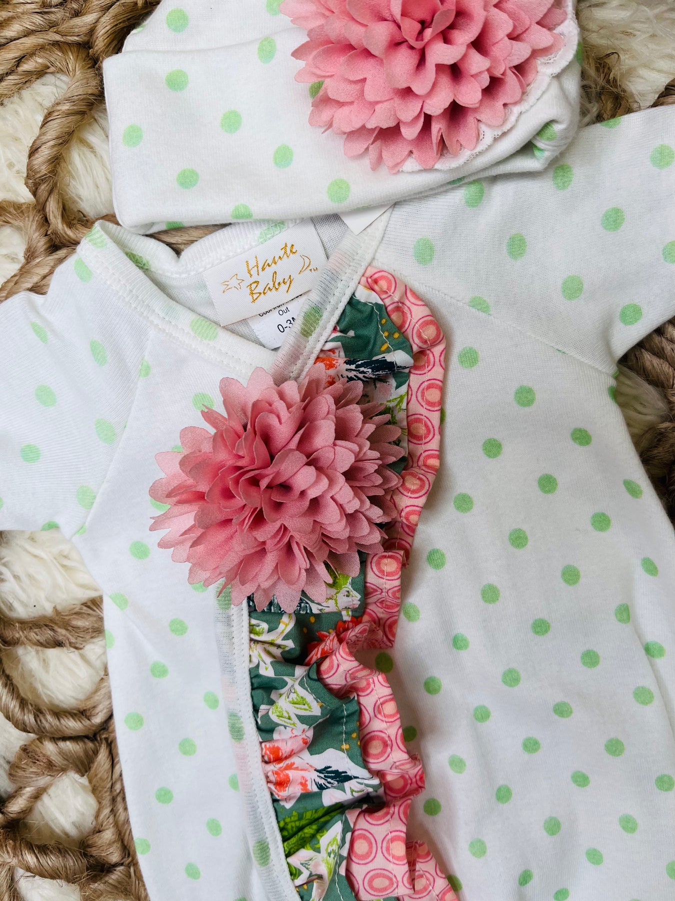 Indulge your little one in the cozy comfort of the Haute Baby Polka Dot Sleeper. Featuring charming garden-themed designs in delicate shades of pink and green, this sleeper is perfect for both nap time and play time. Complete the look with the matching hat for an adorable and stylish outfit.