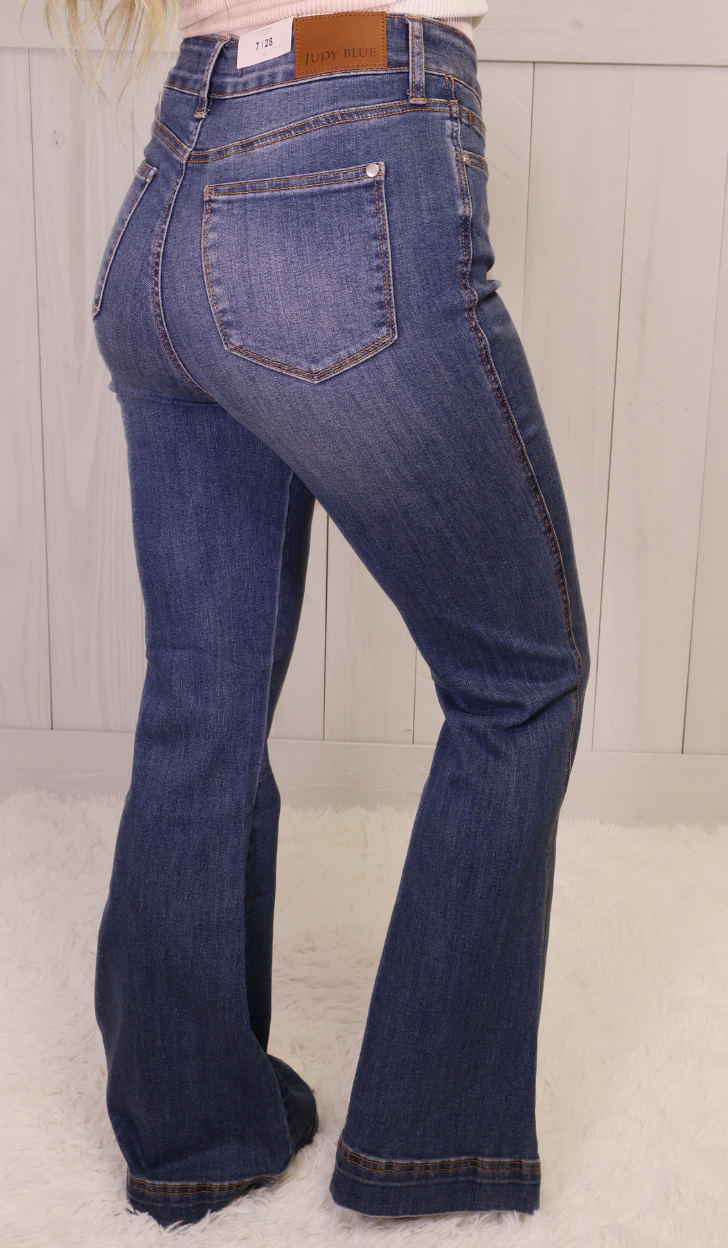 Flaunt your curves in style with our Judy Blue Flare Double Button Jeans 1018. These jeans feature tummy control technology, giving you a smooth and flattering silhouette. With these jeans, you can confidently take on your day while looking and feeling great.
