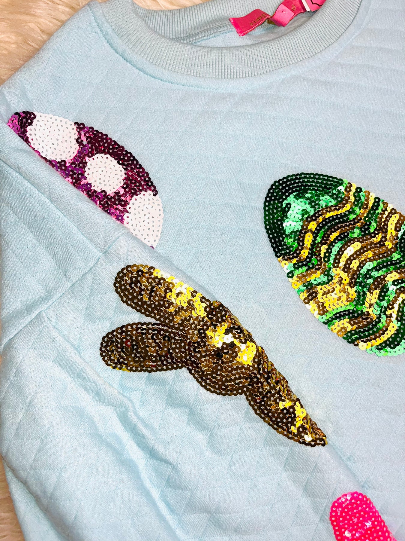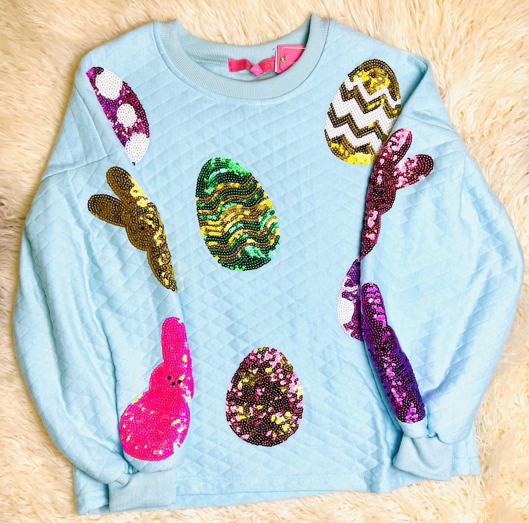 EasterThis Simply Southern Easter Egg patches sweater offers a festive touch to your wardrobe with its shimmering Easter egg sequins. Elevate your outfit with this eye-catching and fun sweater, perfect for springtime gatherings. Bring a touch of sparkle to your holiday events with this unique and stylish piece.