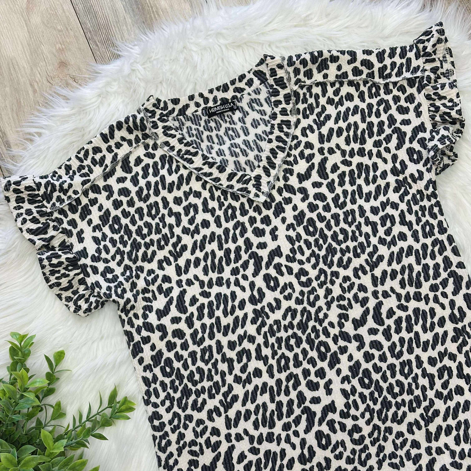 The Women’s Cheetah Ruffle Sleeve Ribbed Top combines a stylish cheetah pattern with a ribbed texture, enhancing both visual appeal and comfort. The ruffle sleeves offer a feminine touch, making it suitable for various occasions. This top is designed for ease of wear, providing a flattering fit for diverse body types.