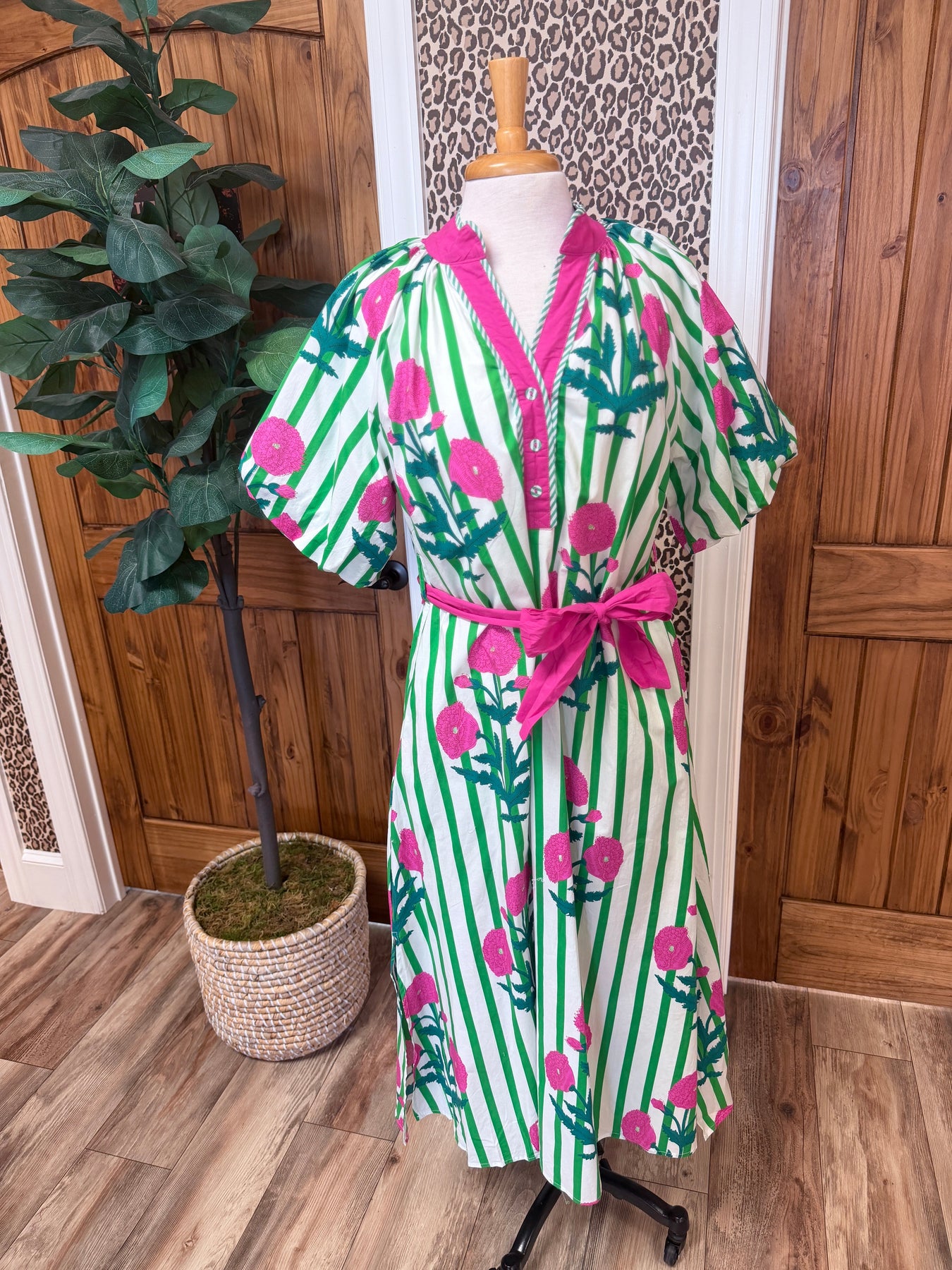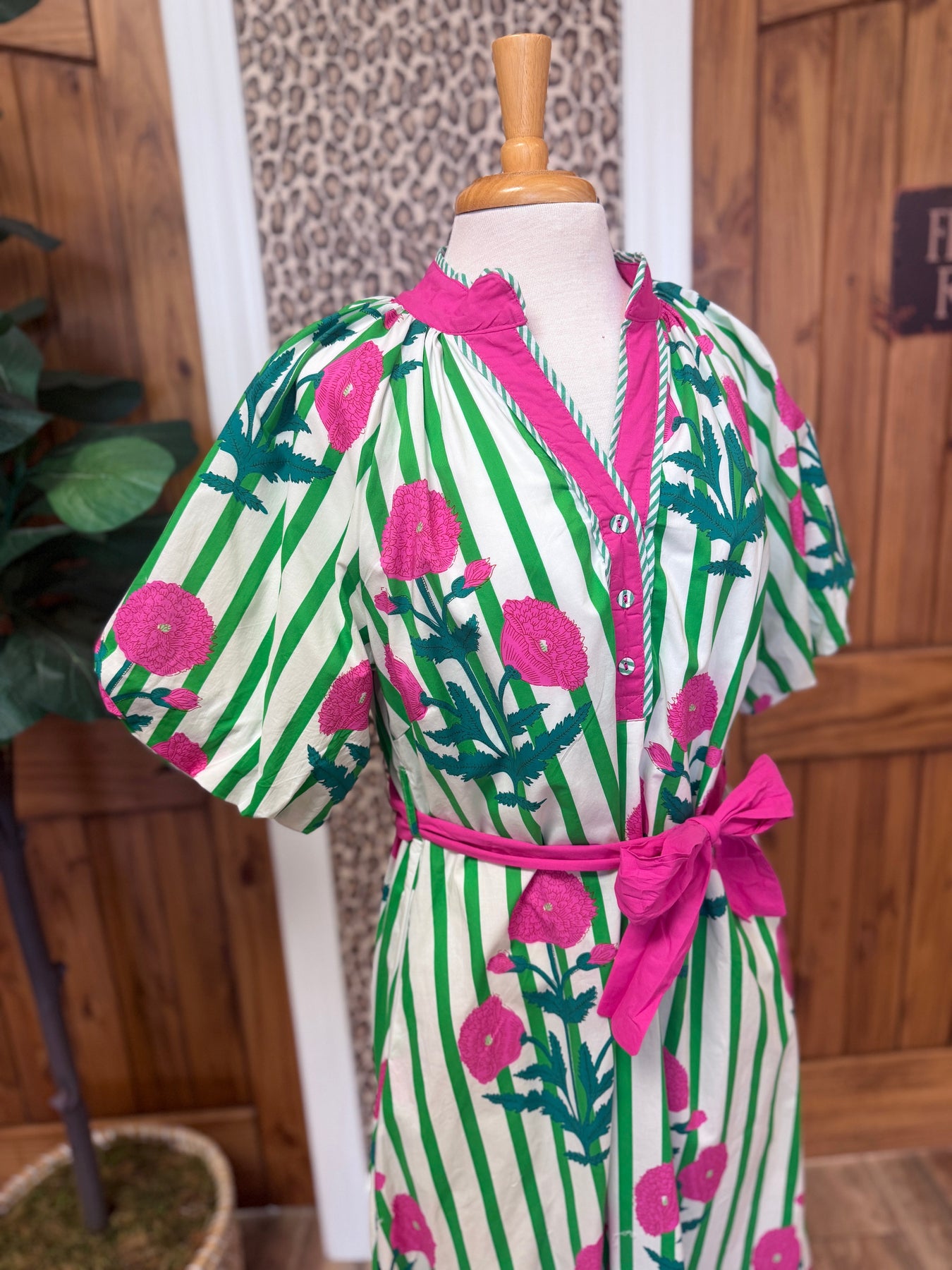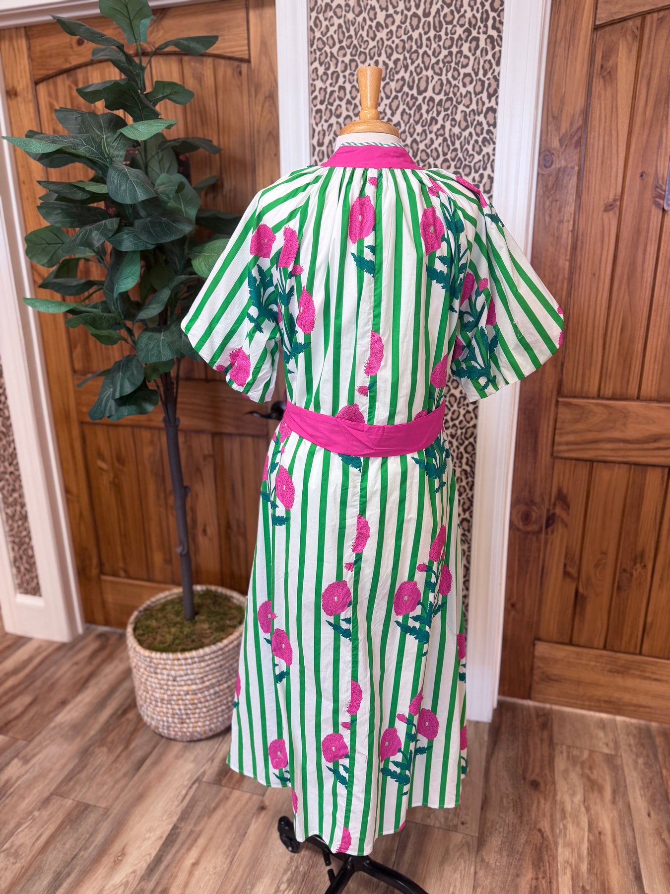 The Women’s Green and Pink Floral Stripe Maxi Dress combines a vibrant floral pattern with a striped design, creating a visually appealing garment suitable for various occasions. Its flowing silhouette ensures comfort and ease of movement, making it ideal for both casual outings and more formal events.