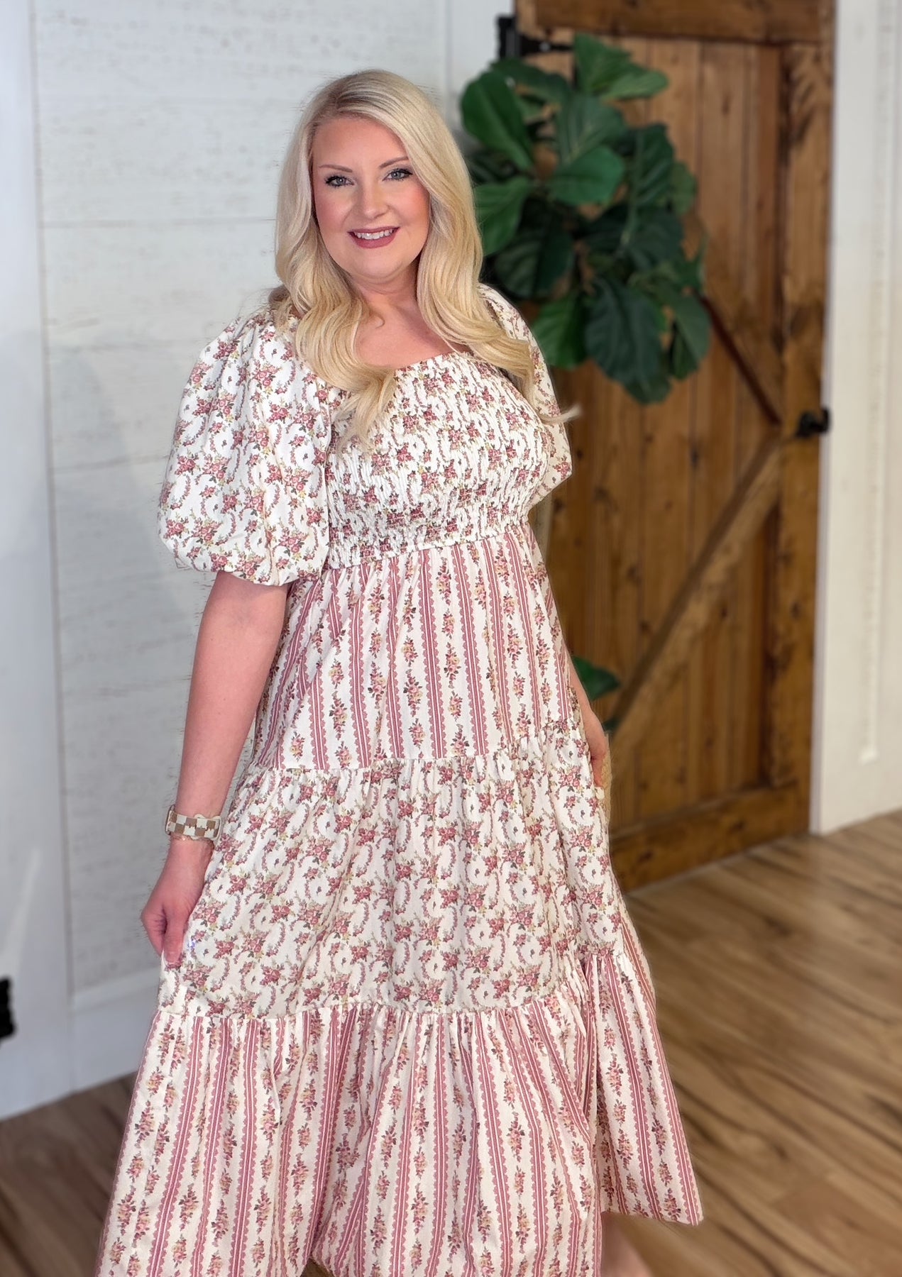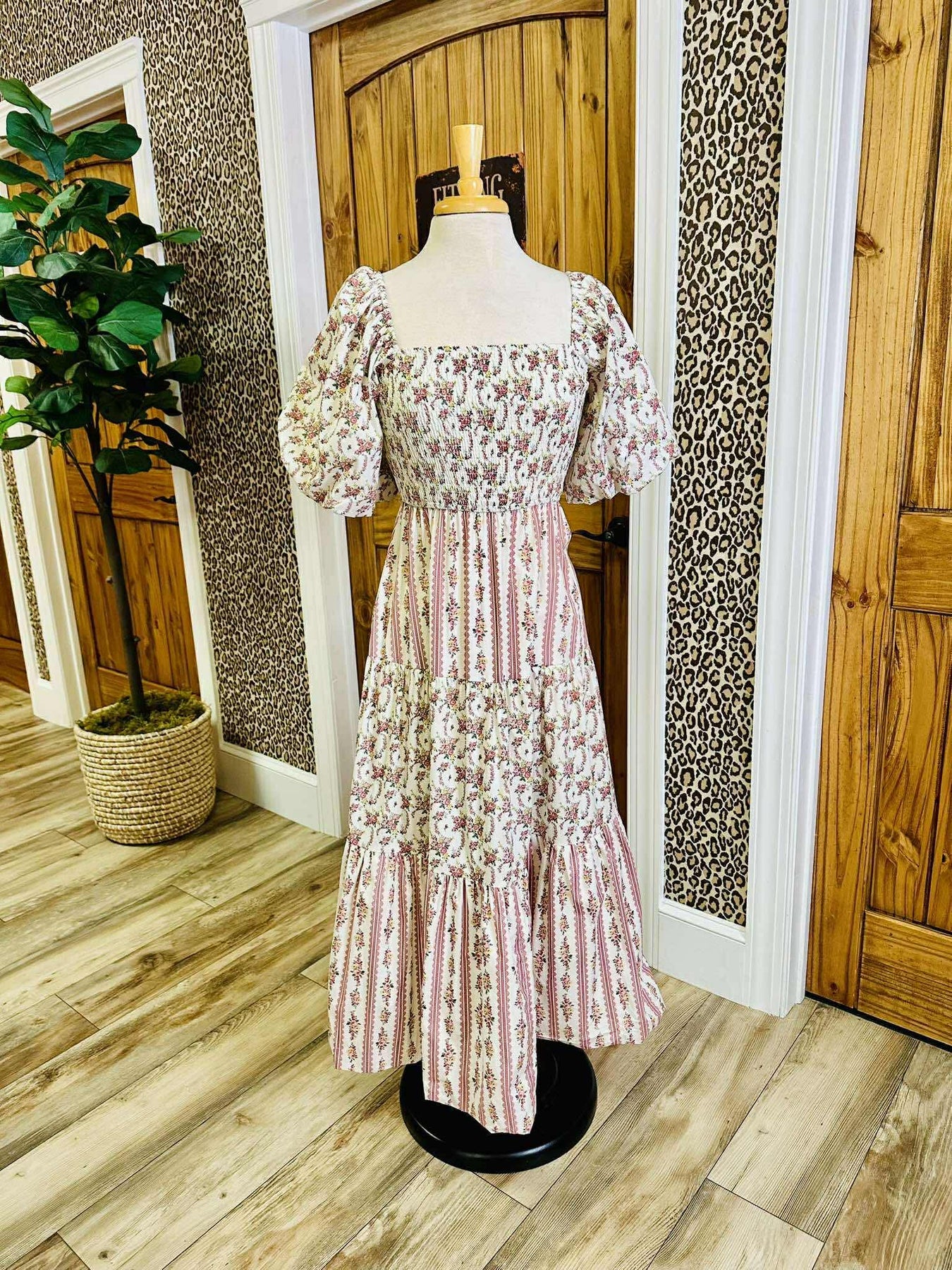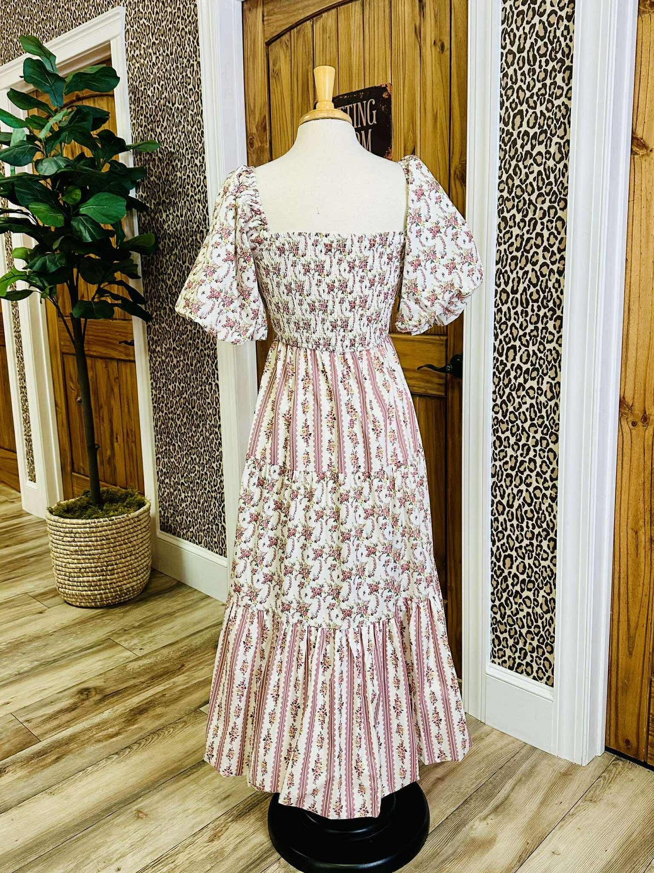 The Women’s Peach Love Cream/Mauve Floral and Stripe Bubble Sleeve Smocked Midi Dress features a smocked bodice and bubble sleeves, providing a comfortable fit while enhancing elegance. The midi length offers versatility for various occasions, and the floral and stripe pattern adds visual interest, making it a stylish addition to any wardrobe.
