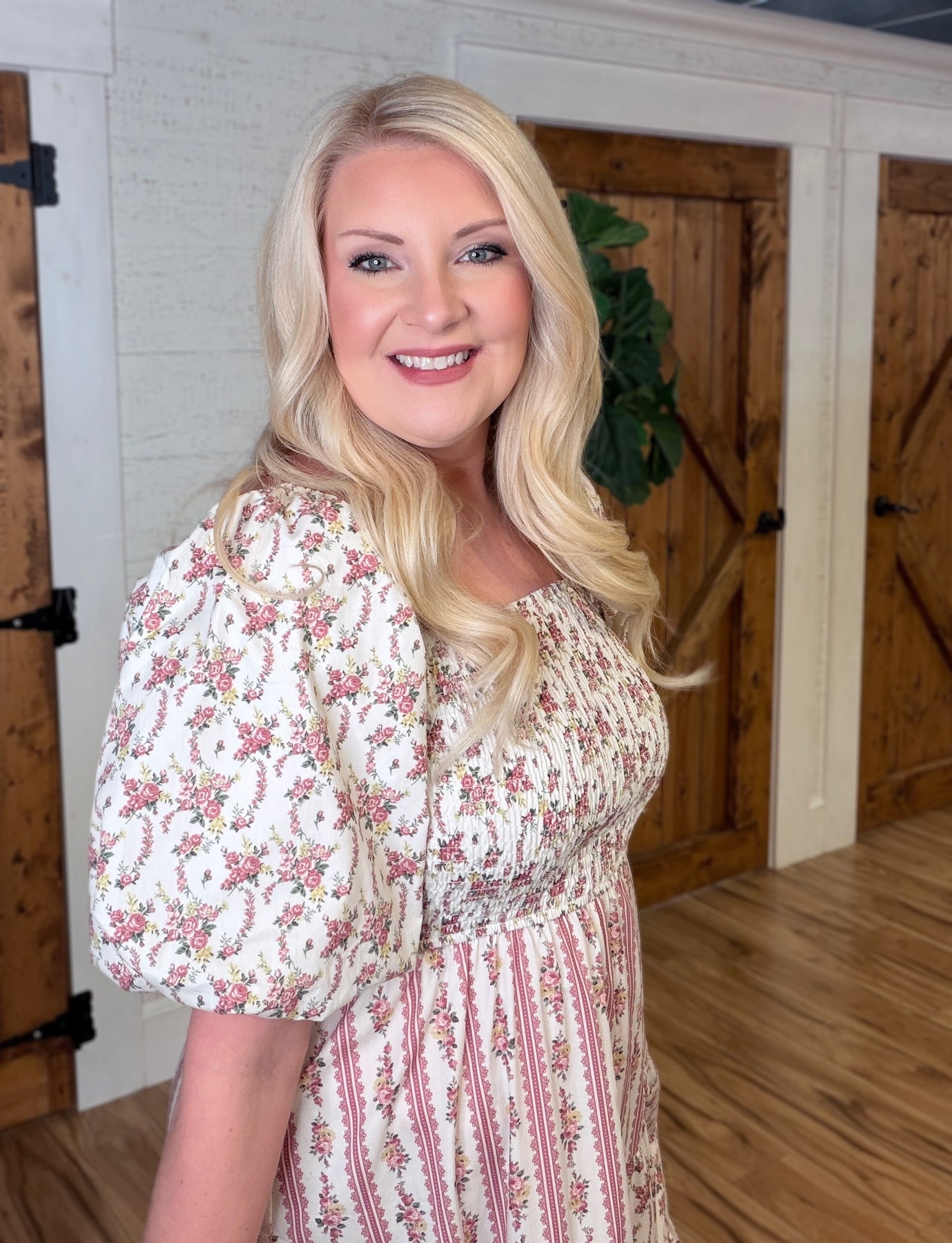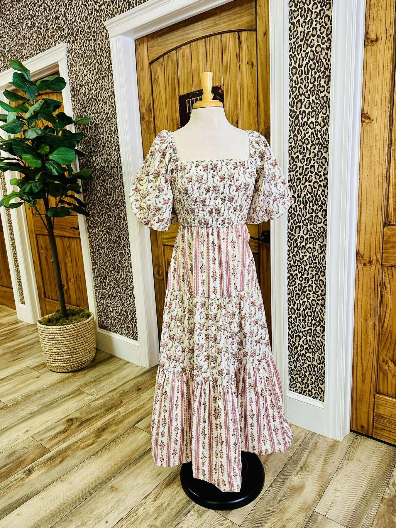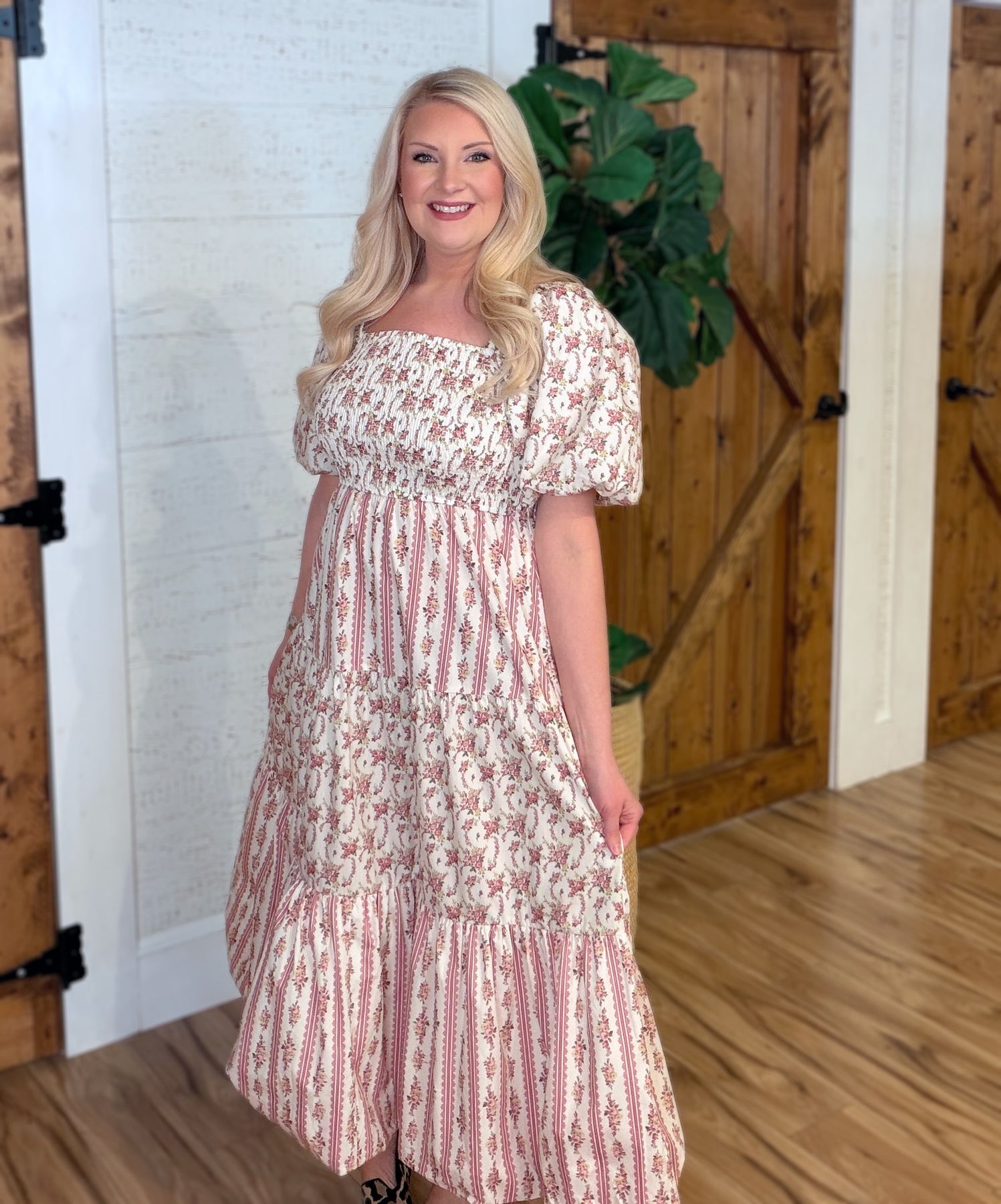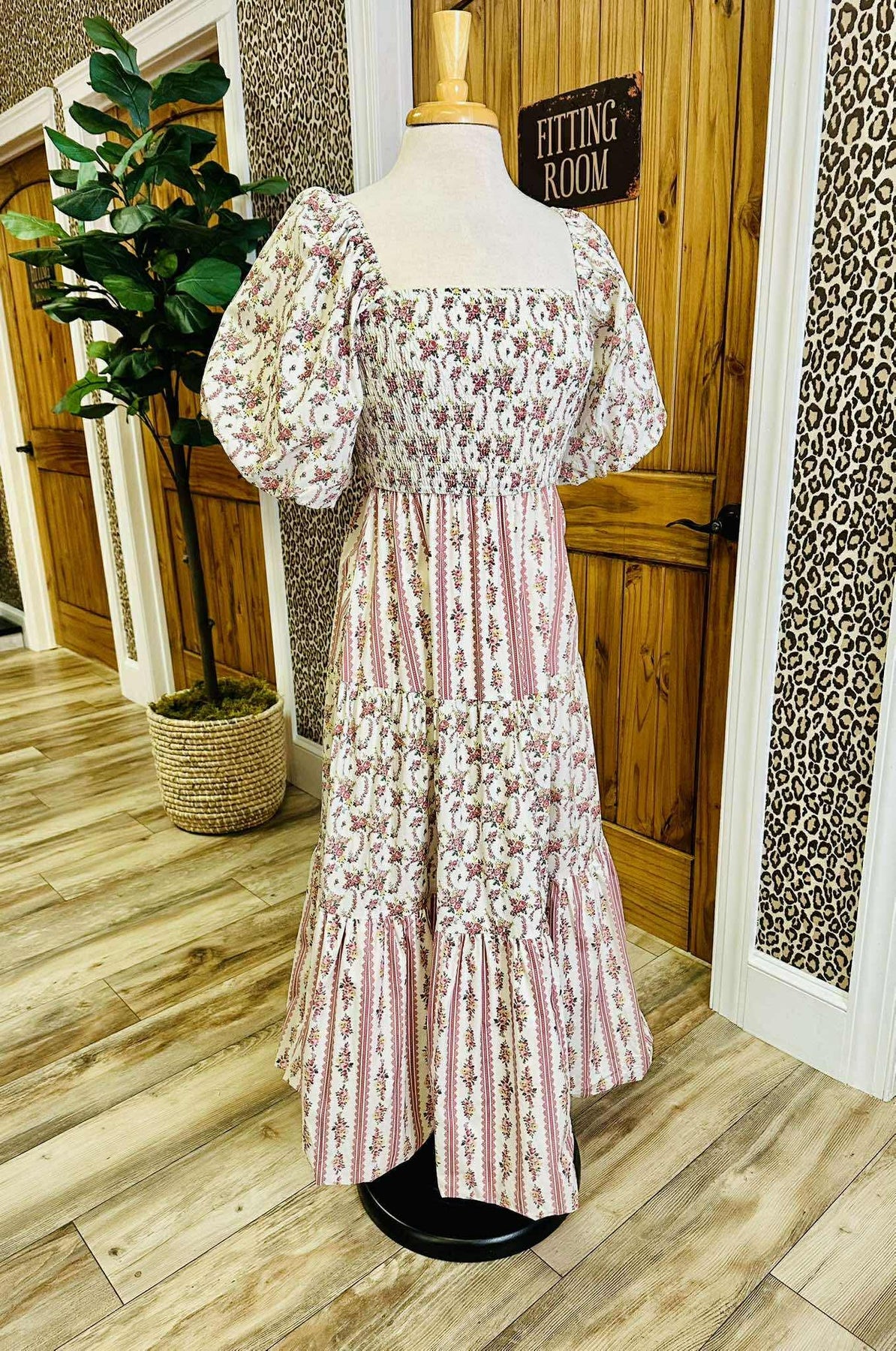 The Women’s Peach Love Cream/Mauve Floral and Stripe Bubble Sleeve Smocked Midi Dress features a smocked bodice and bubble sleeves, providing a comfortable fit while enhancing elegance. The midi length offers versatility for various occasions, and the floral and stripe pattern adds visual interest, making it a stylish addition to any wardrobe.