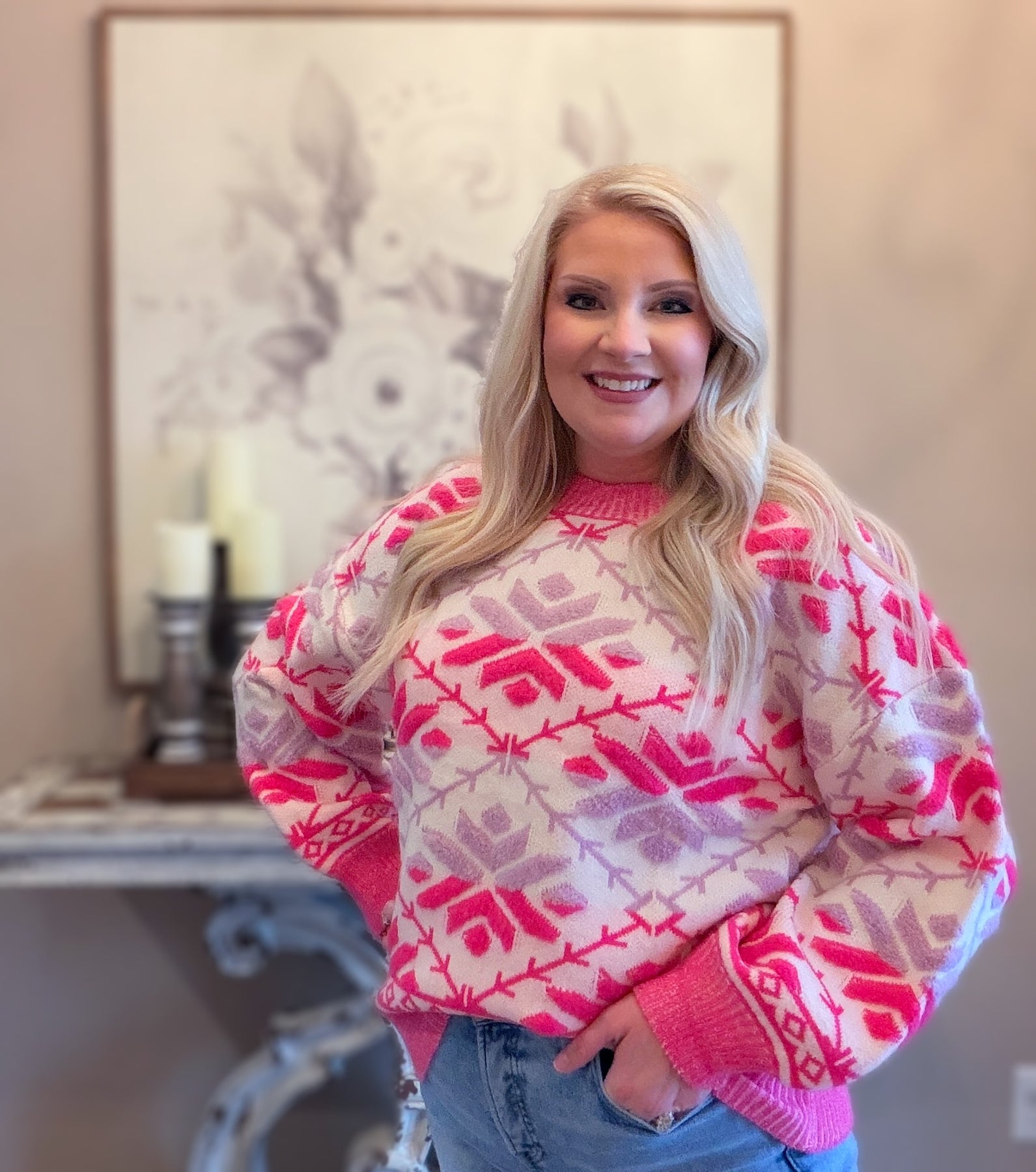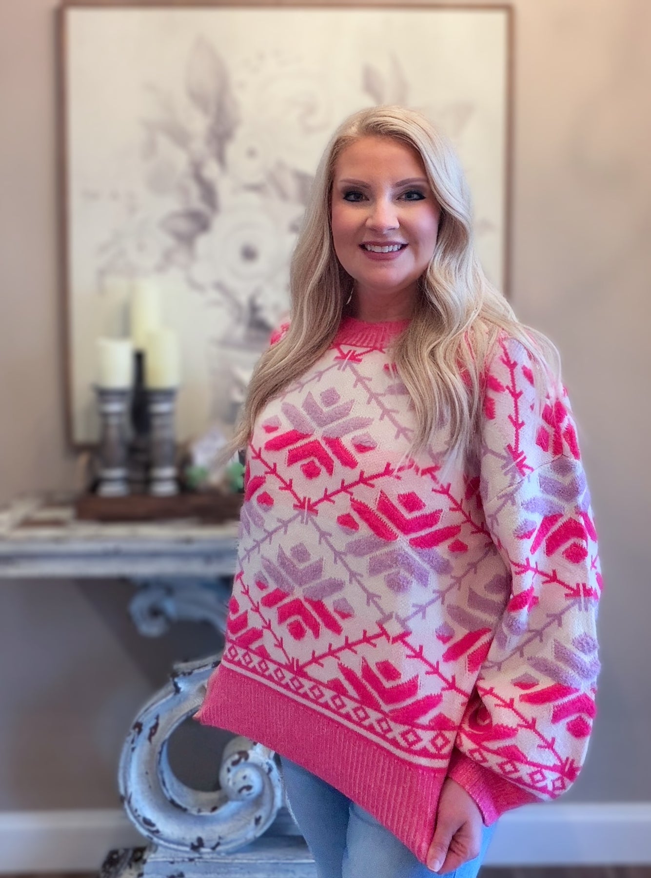 Don’t sacrifice comfort for fashion when you can get the best of both worlds with this pink and lavender knit sweater! Crafted with a cozy sweater fabric, this print adds a touch of uniqueness to any outfit!
