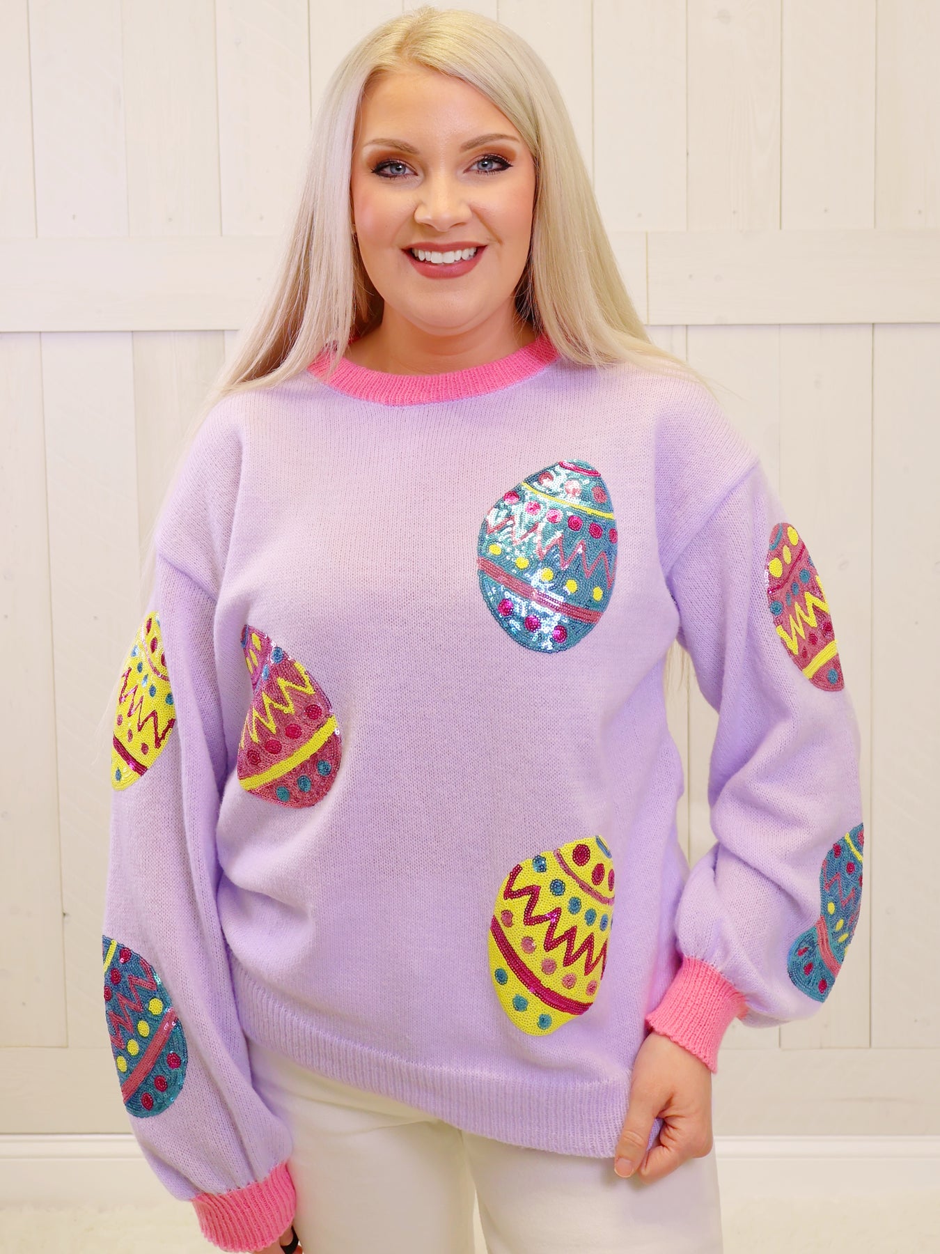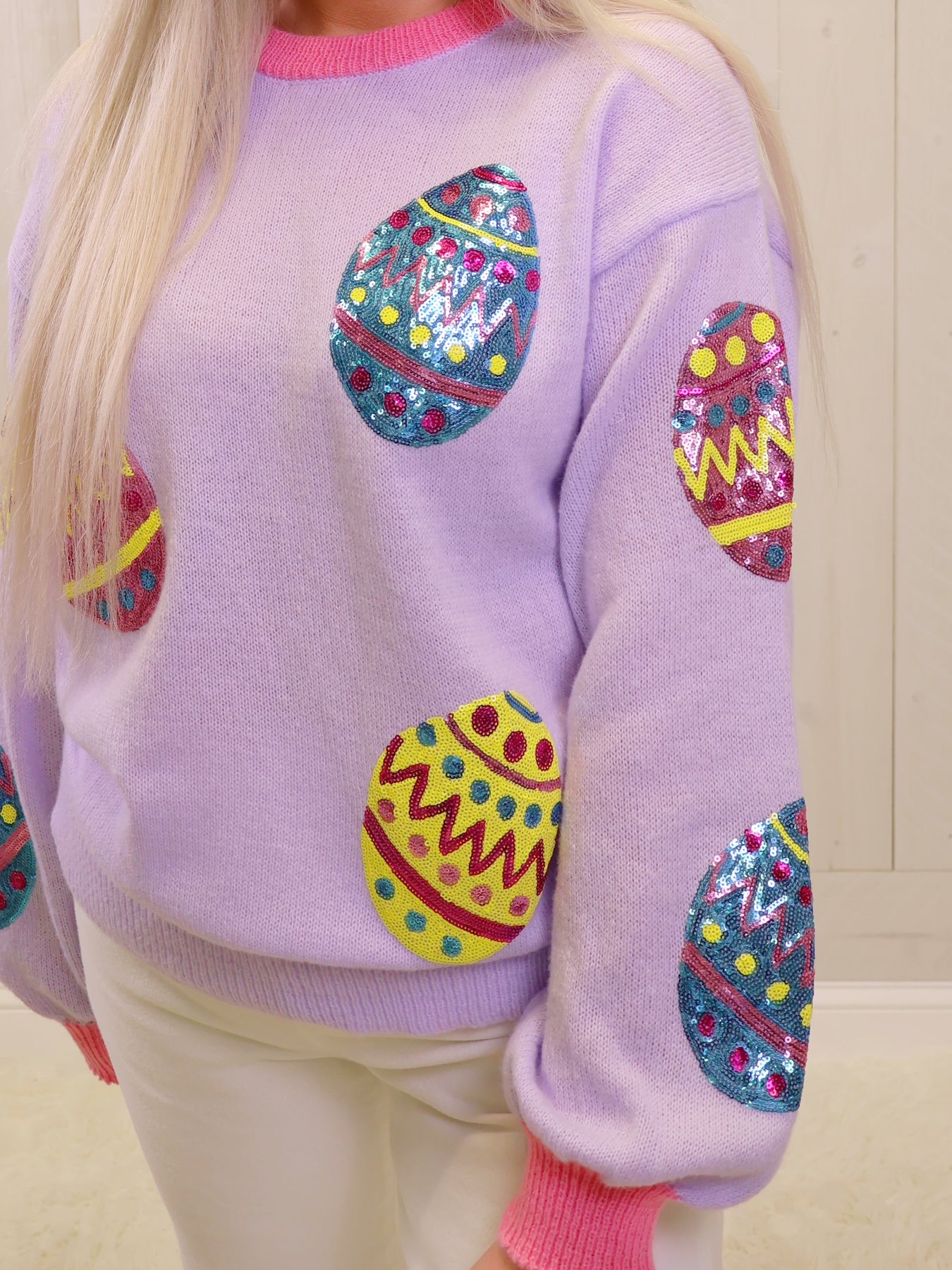 This women's sweater, embellished with shimmering sequin Easter egg patches, is the perfect addition to your Easter wardrobe. Enhance your seasonal attire with a touch of festive flair.